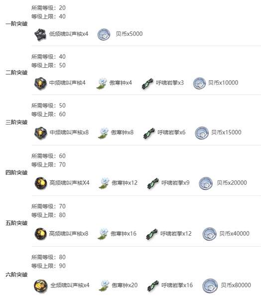 3、三阶突破:中频啸叫声核x8、傲寒钟x8、呼啸岩拳x6、贝币x15000