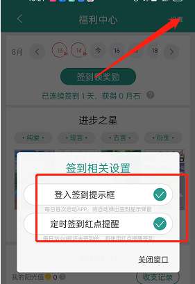 3、选择设置后,找到下方的签到提醒并开启就可以了。