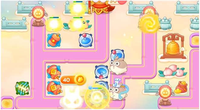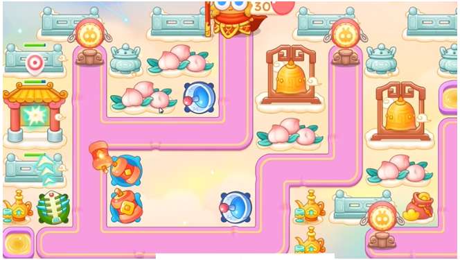3、上面钱袋打掉之后,建立一个雷达,锁定下面木桌,木桌打掉之后,空出位置买鞭炮,继续清理附近木桌,之后打萝卜门。