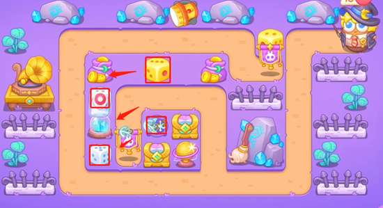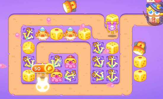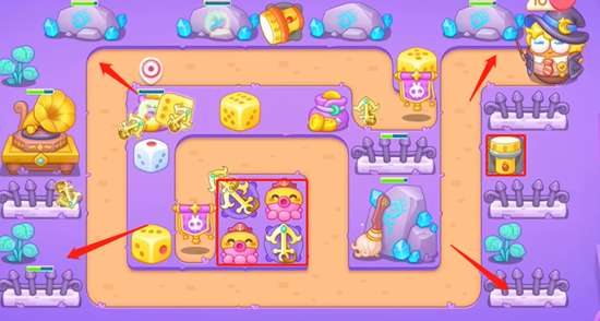 4、拿到全清之后我们在线上放置更多的船锚和骰子,这关需要注意的是骑扫把的兔子速度很快,没有减速炮台。