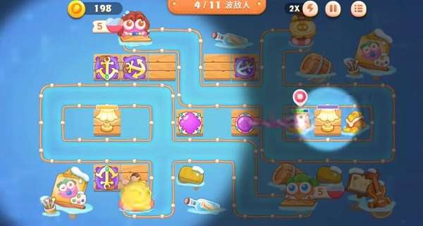 1、开局先升级地图上给的两个船锚,再在上面的船锚旁边放一个船锚。