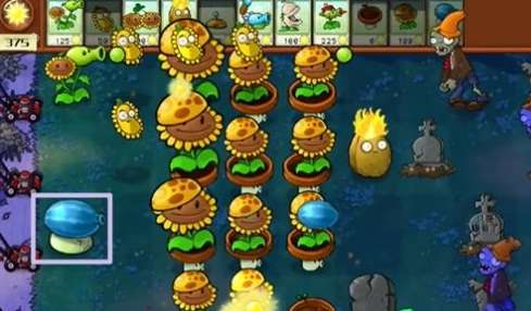 6、一个冰瓜大喷菇可以同时攻击三行僵尸,建议玩家分开放置,后期阳光充足的情况下可以多放。