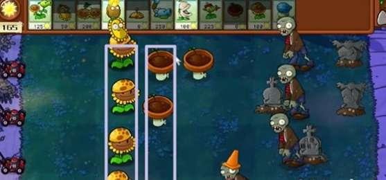 2、在第一波主要是收集阳光,所以在下图位置摆放两排阳光向日葵并在同样的位置叠加小盆菇。