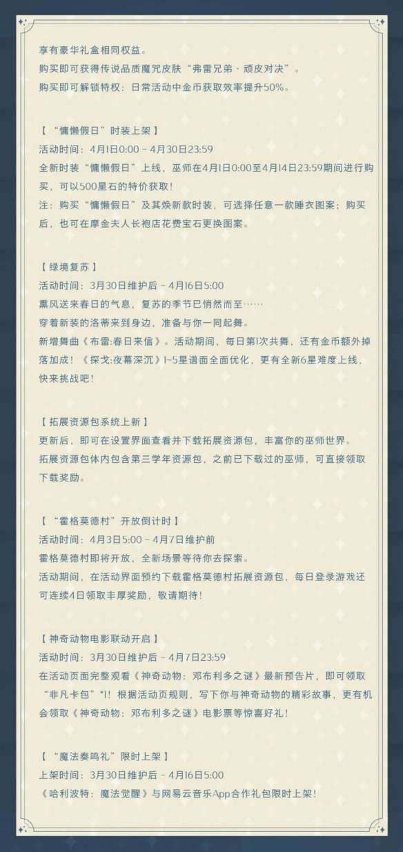 哈利波特3月30号更新了什么?哈利波特马上就要开启新赛季了,4月的卡牌服装预告也陆陆续续出现得差不多了,今天十大评测小编给大家分享一下哈利波特3月30号更新内容介绍,一起来看看吧。