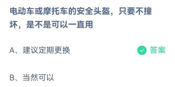 2022支付宝蚂蚁庄园7月8日的题目为:电动车或摩托车的安全头盔只要不撞坏是不是可以一直用?正确答案是什么呢?很多小伙伴可能还不太清楚。下面小编就为大家带来了正确答案分享,希望能帮助到你。