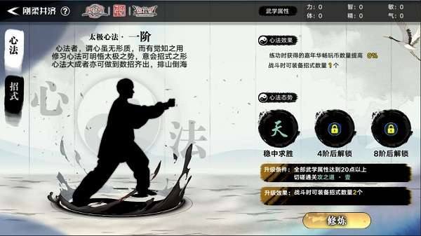 3. 通关【无极之道】指定关卡,并获取一定武学属性后,可提升太极心法等级: