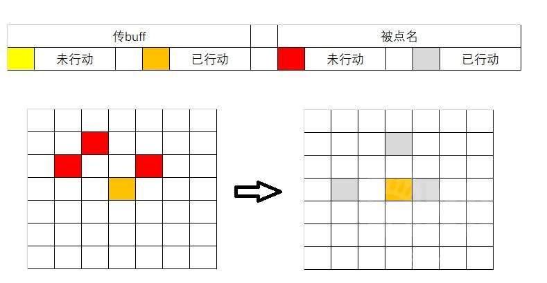 传buff机制:回合结束后会把身上倒计时-1,然后传给直线2格范围内友军(只有1回合倒计时的无法传递)