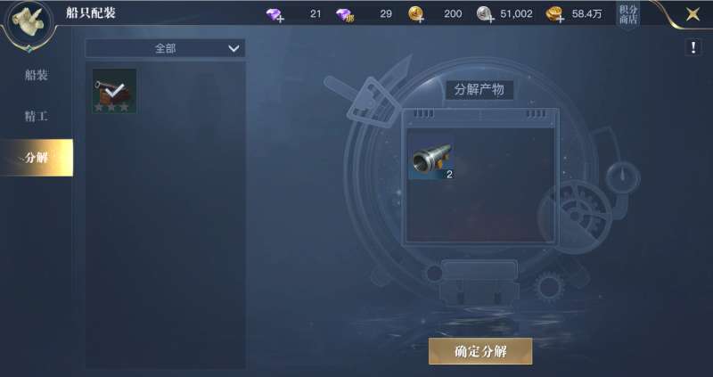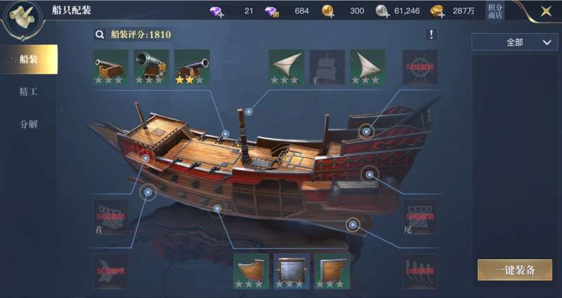 船装在第二日主线中即可获得,每个位置的船装均可通过精工升级品质、及强化升阶,获取相对应的属性提升。次玩法材料需日积月累,推荐大家第二日分解不需要的船装,适当精工即可。