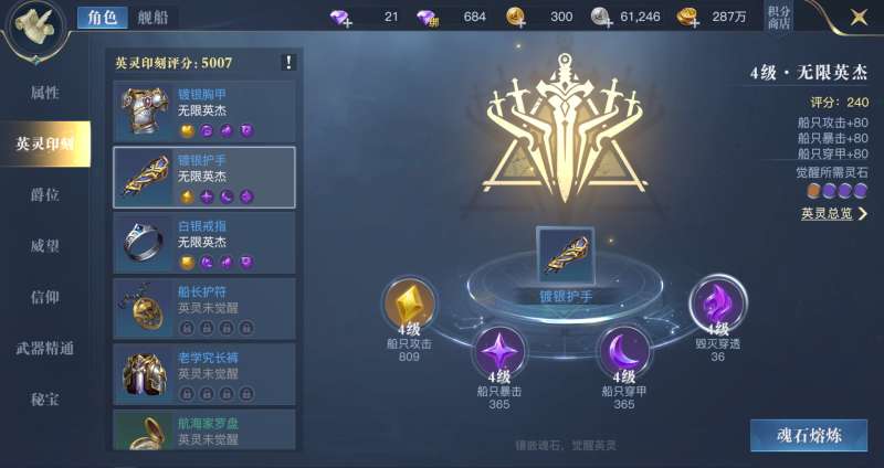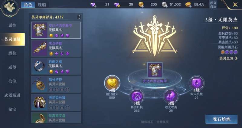 建议第二日刻印1金魂石加上3个紫色魂石,觉醒无限英杰效果,并将镶嵌魂石都尽量提升到同等级即可。