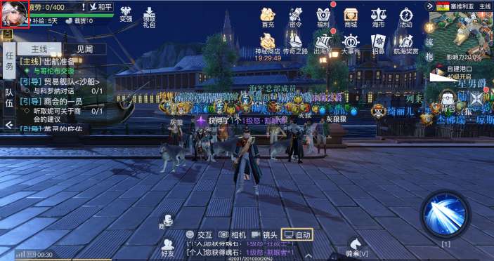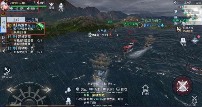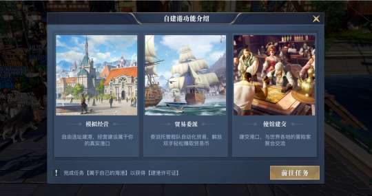 开服第一件事就是完成主线任务。新手任务结束后,继续跟随指引做主线任务,就能获取入港许可证、学习建造船只、选择职业、学习贸易等一系列内容。主线任务全程有寻路指引,非常简单。
