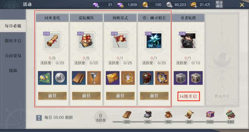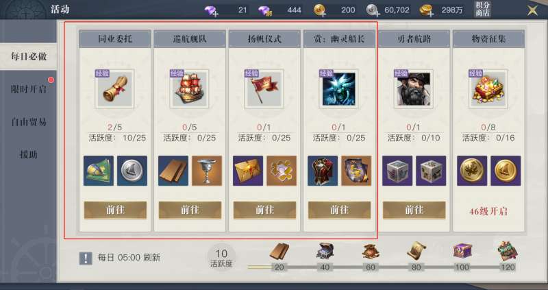 完成所有教学任务后,就需要通过每日活动获取经验。当前只解锁了三个:同业委托、巡航舰队、扬帆仪式。