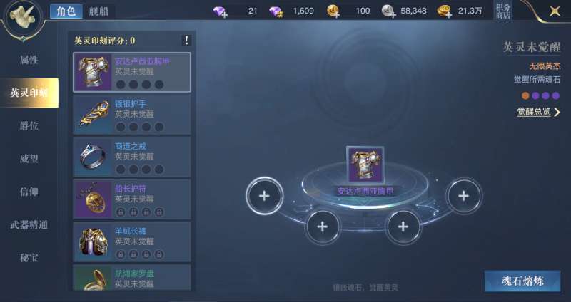 英灵印刻中一件装备可以镶嵌四颗魂石,每种魂石加成属性不同。而英灵觉醒,则是不同品质魂石搭配下,所呈现的不同的BUFF加成。