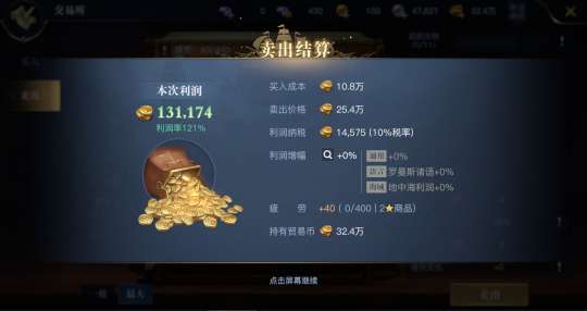 随后就是进行贸易,前期贸易币消耗巨大,建议用光所有疲劳。由于高星商品价格、消耗疲劳值高,推荐优先贸易高星商品。
