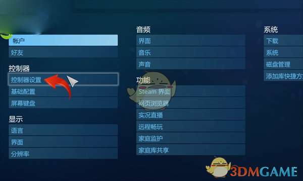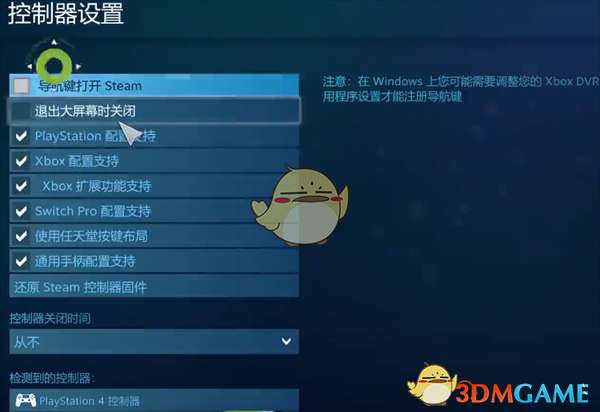 2、点击steam大屏幕模式中右上方的齿轮选项,随后选择控制器设置即可查看自己插入的手柄设备,若是没有识别手柄可以通过勾选手柄选项来设置手柄的支持,点击手柄选项也可以直接设置手柄本身键位设置。