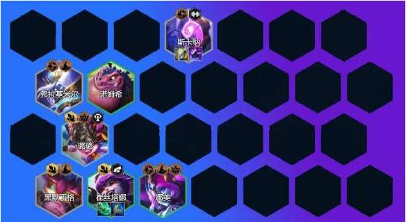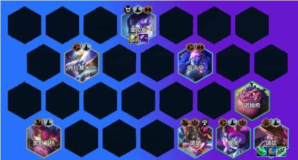 4-5或5-1升8人口,大搜卡找到找到索尔阵容成型,瑞兹装备给予索尔,朔极之矛给予娜美就好。在索尔没来之前可以用娑娜过渡。稳血后升9添加佐伊或巴德(佐伊更优质)找到2星索尔就可大概率前二名。
