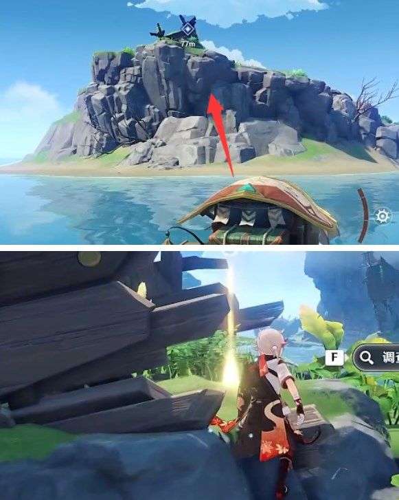 2、跟随任务的指引来到下图位置以后,一直往顶部爬去可以看到光亮调查点。