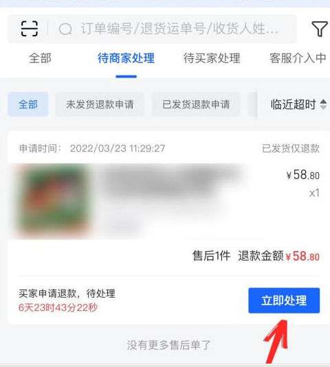 第二步:在售后管理列表里选择退款的订单后点击立即处理,如图所示。