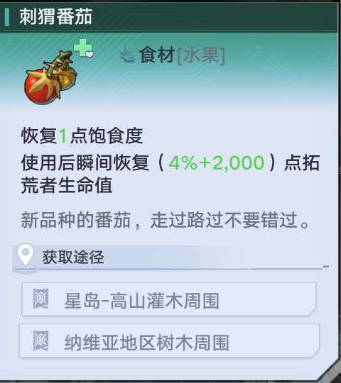 刺猬番茄:玩家可以在星岛高山灌木周围、纳维亚地区树木周围采集。