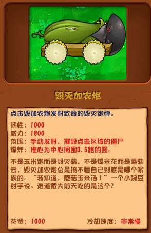 不是玉米炮而是毁灭菇,不是爆米花而是蘑菇云,毁灭加农炮总是搞不懂自己到底是哪个家族的。“我知道,蘑菇玉米汤!”一个小豌豆射手说。难道戴夫前天吃的是这个?