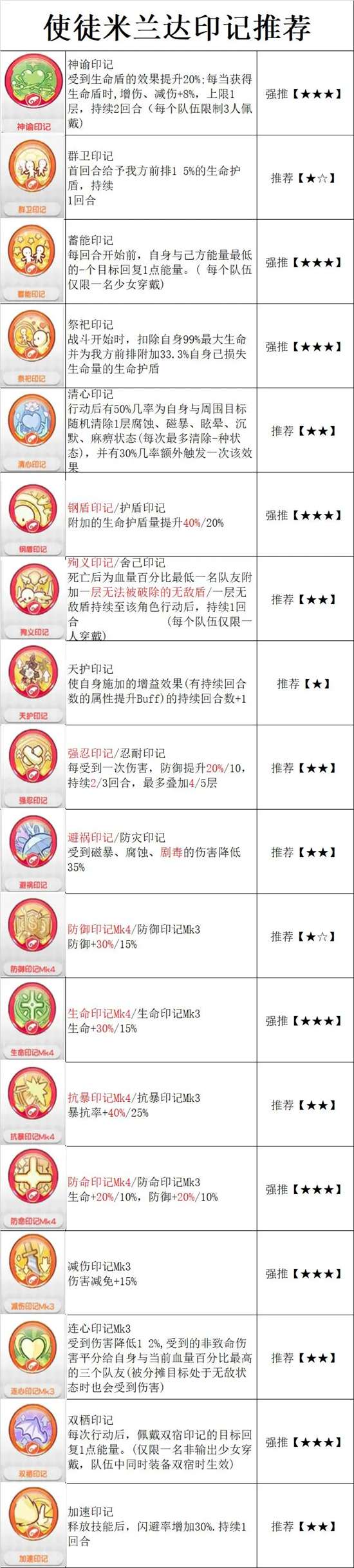 使徒米兰达属于一人吃饱,全家不饿的那种,回能一定要充分,血量和【钢盾印记】可以提升护盾的数值,减伤可以大幅度增加米兰达的生存能力。