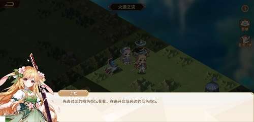 4、接着往上走会看到蓝色的祭坛,还是先和小姐姐对话,她会告诉你,先开褐色的,再开蓝色的,没提到是否是跟随者绿色的顺序,那么就先放着,去找其他线索。