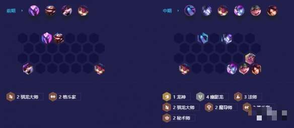 开局用驯龙大师+格斗家过渡,2-5升五人口,不仅可以有概率拿到赛芬,而且搭配上强袭炮手+神龙烈焰可以更好的保证前期的连胜,3-2升六人口,用塞拉斯替换其中一个格斗家,搭配上娜美就可以开三法师了,4-1升七人口,大搜一波找到赛芬和娑娜/库奇,用赛芬替换塔姆,就可以组成4幽影龙+2驯龙大师的基础羁绊了,后续就是上八人口搜二星赛芬以及五费卡,看情况上九人口补足五费卡的质量即可。
