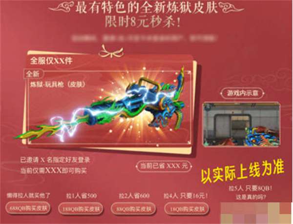 4、同时还有八元秒杀的活动,炼狱玩具枪皮肤邀请五人就可以用八块的价格拿下这个皮肤,但是邀请人的任务还是比较难做的。