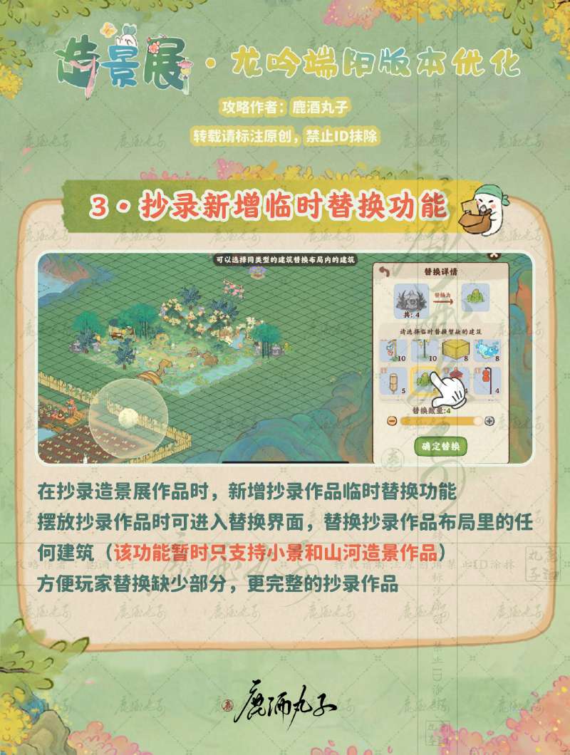 摆放抄录作品时可进入替换界面,替换抄录作品布局里的任何建筑(该功能暂时只支持小景和山河造景作品)