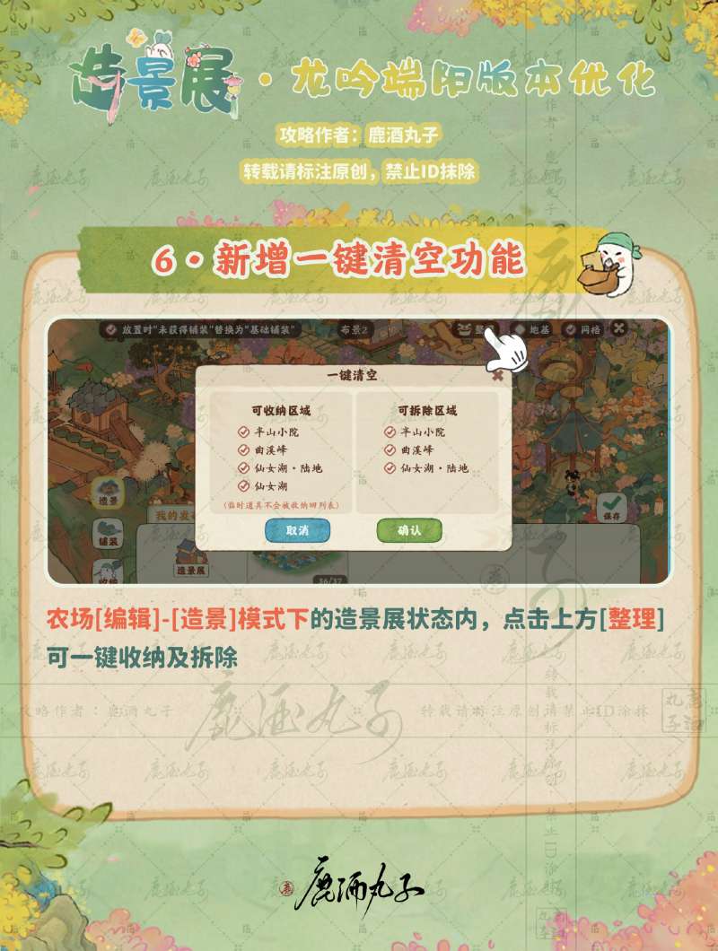 农场[编辑]-[造景]模式下的造景展状态内,点击上方[整理],可一键收纳及拆除