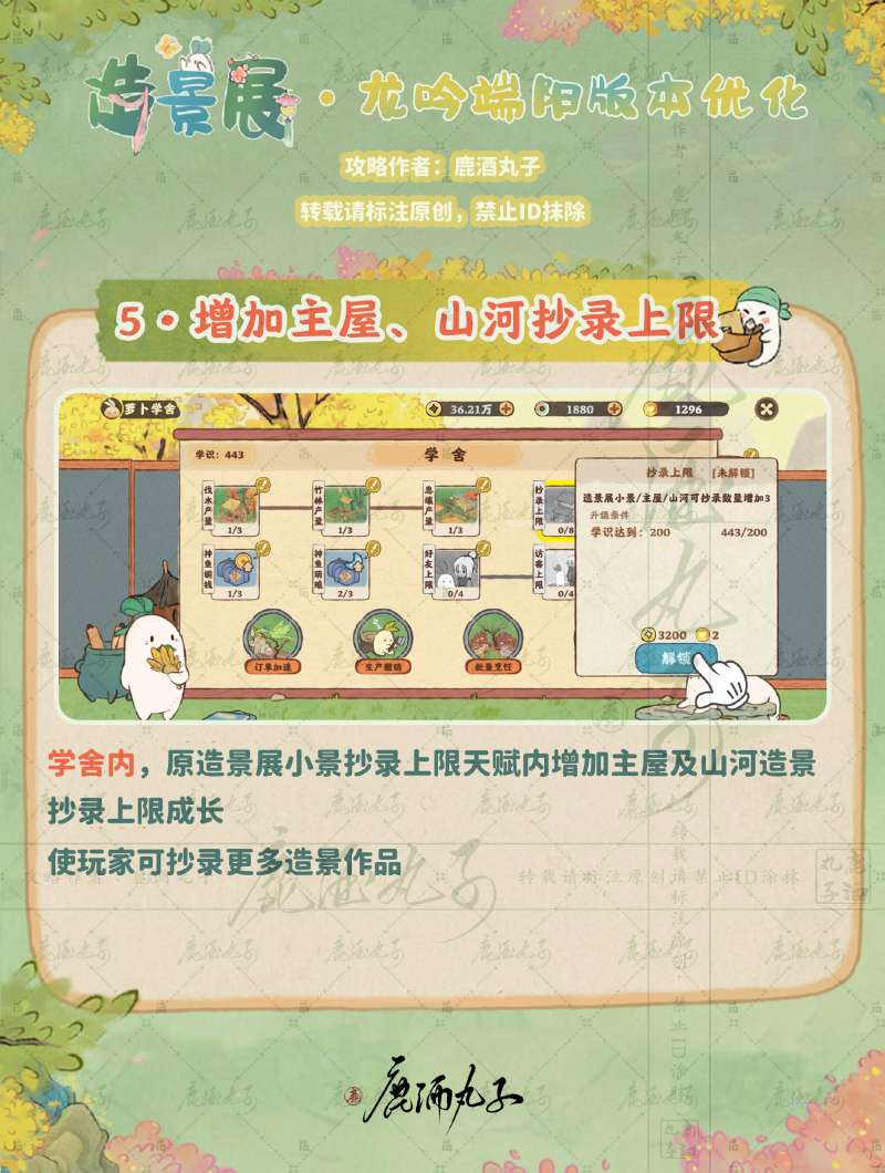学舍内,原造景展小景抄录上限天赋内增加主屋及山河造景抄录上限成长
