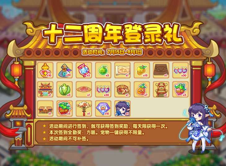 活动期间登录签到,即可获得各种奖励,其中还包含十二周年纪念家具以及B站魔方工作室官方号联动特备宠物:方糕哦!