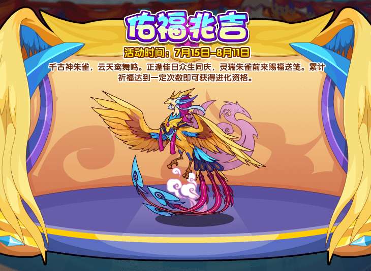 千古神朱雀,云天鸾舞鸣。正逢佳日众生同庆,灵瑞朱雀前来赐福送笺。累计祈福达到一定次数即可获得进化资格。
