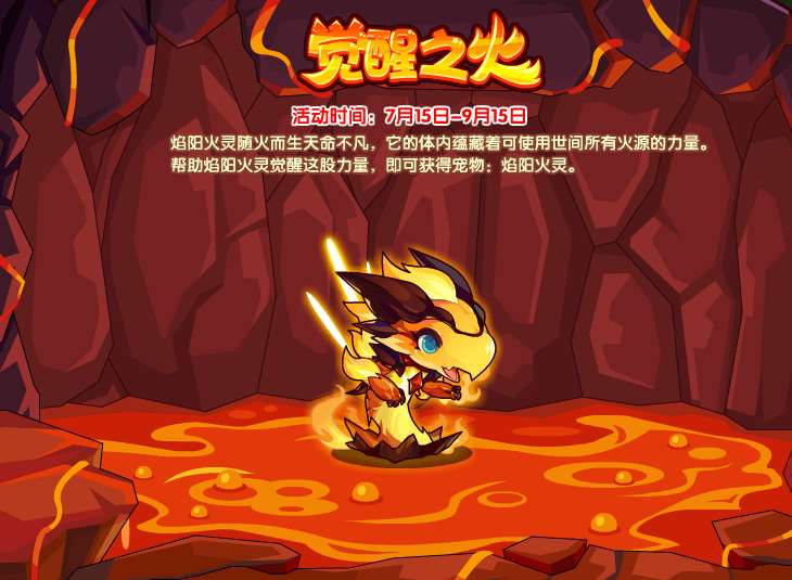 觉醒了力量的焰阳火灵,为了树立起自己的威望,四处挑战各系实力强劲的宠物。行走四方皆无惧,燃烬敌手皆无畏。完成活动即可获得宠物进化资格!