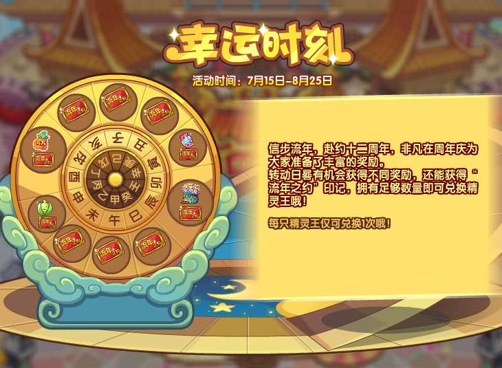 例如:①初始幸运时刻是“丑”时(流年之约*3),那么首次刷新(免费)后幸运时刻会在“亥”时和“巳”时(流年之约*6)中随机,再次刷新(800洛克贝)后幸运时刻将会在“子”时和“午”时(流年之约*10)中随机;②初始幸运时刻是“巳”时(流年之约*6),那么首次刷新(免费)后幸运时刻会在“子”时和“午”时(流年之约*10)中随机。