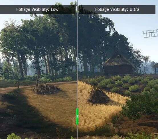 树叶可见距离: 树木和草地的最远显示范围,是非常影响帧数的设置. 从低到超高 的画质与帧数影响都是线性的,建议最后调整以在帧数和画质之间取舍.