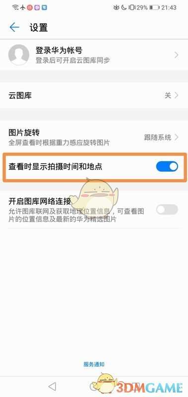 4、然后点击开启查看显示时间和地点开关。这样操作完成,华为手机中的图片库的图片就会按照拍摄时间顺序进行排序了。