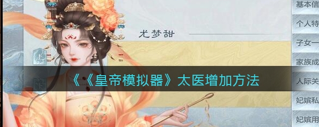 皇帝模拟器手游是一款模拟经营类型的游戏,游戏中太医怎么增加呢,只有一个太医特别害怕妃子生病,下面十大评测小编就给大家带来了《皇帝模拟器》太医增加方法介绍,感兴趣的一起看看吧!