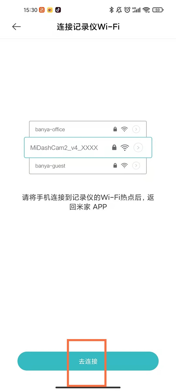 2、按照提示界面,打开记录仪 Wi-Fi 热点,点击下一步,再点击“去连接”。