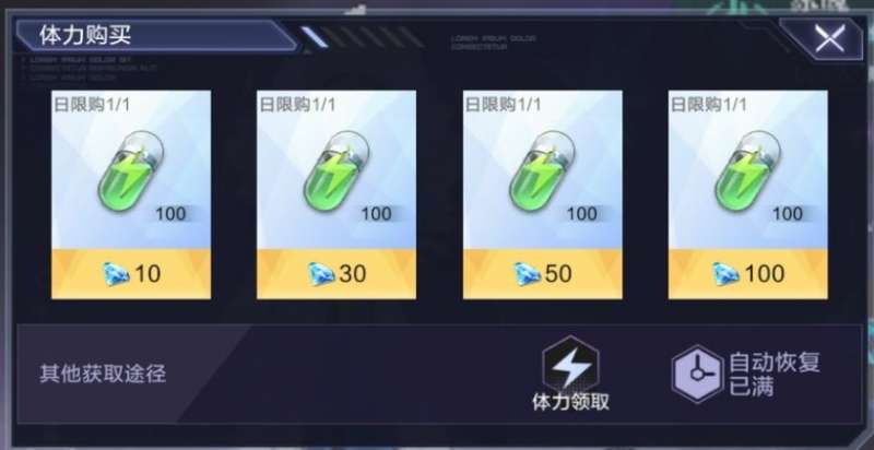 另外每天还可以消费190钻石购买体力,每次可获得100体,可以购买4次,第一次10钻,第二次30钻,第三次50钻,第四次100钻。