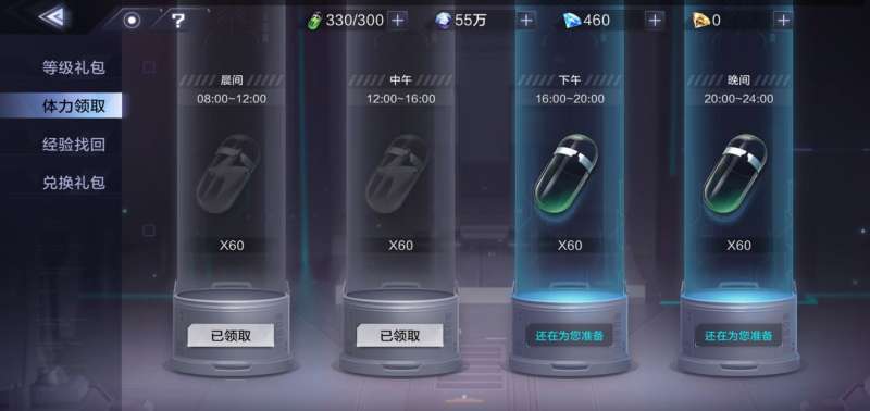 除了自回体外还可以免费领取体力,每天有4个时间段可以领取体力,合计240点,时间分别为:8:00-12 :00 12:00-16:00 16:00-20:00 20:00-24:00
