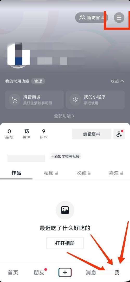 1、首先,打开手机上的抖音APP,在主页内,点击(我),点击右上角三个小横条;