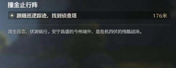 1、首先玩家需要解锁【撞金止行阵】任务,跟随巡逻踪迹,找到侦查塔。