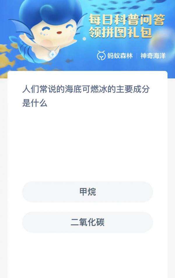 2022支付宝蚂蚁海洋7月29日的题目已经更新了,今天的题目为:人们常说的海底可燃冰的主要成分是什么?正确答案是什么?甲烷还是二氧化碳呢?很多小伙伴可能还不太清楚。下面小编就为大家带来了正确答案分享,希望能帮助到你。