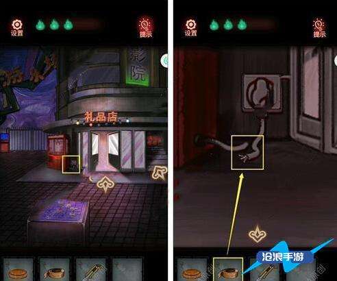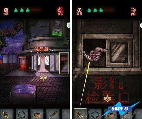 2、看大门出现红手印,根据手印调整红色按钮,获得电源线。用刀割开胶带获得砝码、女孩娃娃。