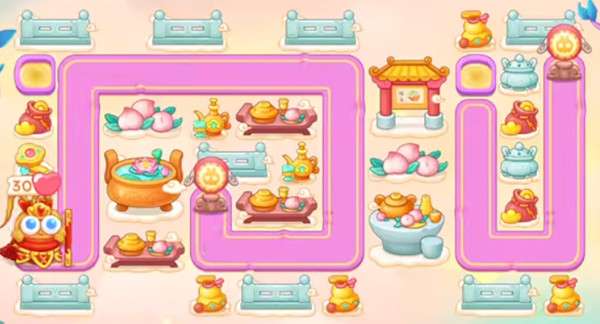 5.锁下面的酒壶,打掉之后放一个火瓶子,锁右边的桃子障碍物。火瓶子优先升级。