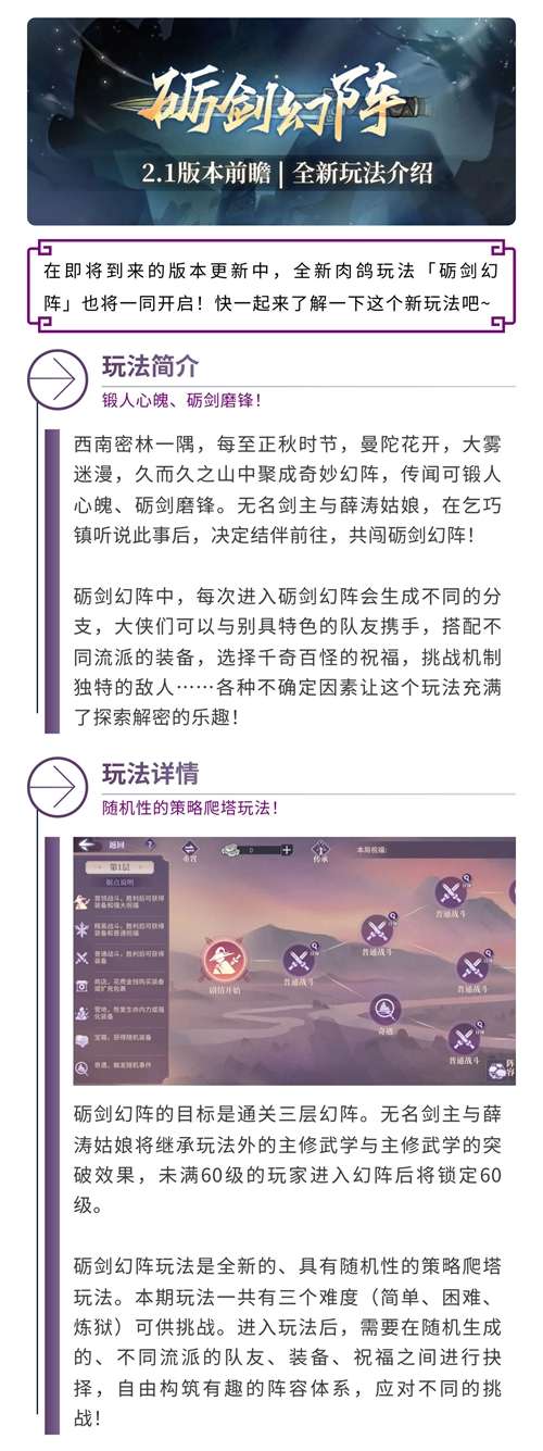 好啦~以上就是有关汉家江湖2.1版本全新肉鸽玩法砺剑幻阵的详细介绍内容啦~如果大家对新版本充满期待的话,那就做好准备,一起迎接明天的到来吧~