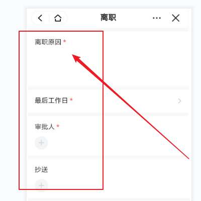 第五步:进入离职页面,点击输入【离职原因、最后工作日、审批人】等离职信息。
