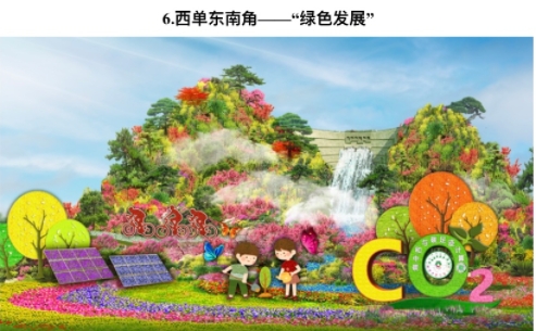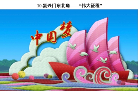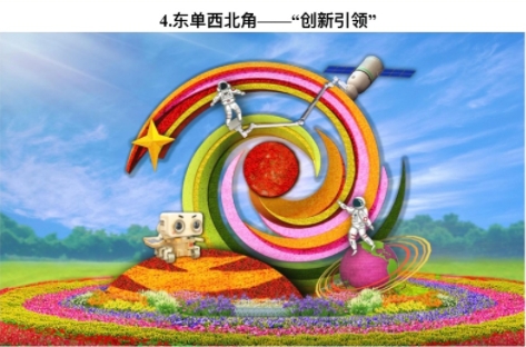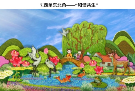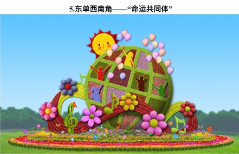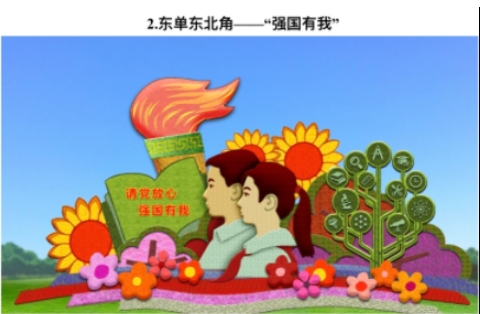 天安门广场两侧绿地延续吉祥如意花带布置方式,花卉布置总面积5050平方米,两侧花球共18个。