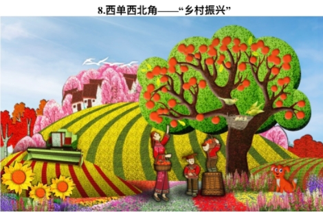 天安门广场中心即将布置的“祝福祖国”主题花坛,花坛顶高18米,以喜庆的花篮为主景。篮体南侧书写“祝福祖国,1949-2021”字样,在篮体北侧书写 “欢度国庆,1949-2021”字样。篮内采用了象征红心向党、奋勇拼搏的向日葵、山丹丹、映山红、红梅及祝福祖国繁荣昌盛的牡丹、康乃馨等花卉,表达了全国各族人民紧密团结在以习近平同志为核心的党中央周围,意气风发、砥砺前行,为实现中华民族伟大复兴的中国梦而不懈努力。花坛底部直径45米,为向日葵图案,寓意朵朵葵花向太阳。