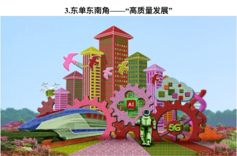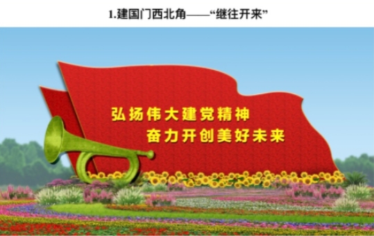 长安街沿线从建国门到复兴门,精心布置10组立体花坛,体现“奋斗百年路、启航新征程”。